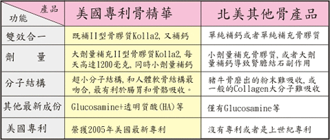 ◆<骨精华>比单纯Glucosamin配方更科学。美国超市MoveFree用的是Glucosamin,研究表明要四丶五年才能修复软骨,<骨精华>以大剂量II型骨胶质为主方,加上Glucosamine等,修复关节软骨,提高骨质密度,大大缩短消除关节疼痛,防止骨质疏松的时间。