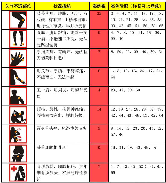 ●退行(化)性和风湿性手/指/肘/肩/膝/胯关节胀痛丶肿胀丶僵化丶无力丶响声丶骨刺丶网球肘丶五十肩丶椎间盘突出丶腰肌劳损丶软骨损伤;